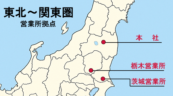 弊社は、福島県のほぼ中央に位置し、東北自動車道、国道4号線に近く物流の利便性が高い「本社」、栃木県南部に位置し、東北自動車道佐野IC、国道50号線に近く物流の利便性が優れております「栃木営業所」、茨城県南地域にあり圏央道阿見東インターチェンジ近くに位置する北関東と首都圏を結ぶ物流の中核拠点である「茨城営業所」を運営しております。